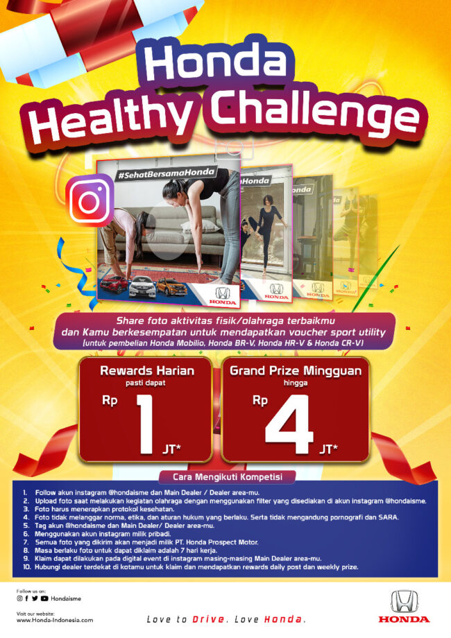 Share foto aktivitas fisik / olahraga terbaikmu dan kamu berkesempatan untuk mendapatkan voucher sport utility (untuk pembelian Honda Mobilio, Honda BR-V, Honda HR-V & Honda CR-V) Follow akun instagram @hondaisme dan Main Dealer / Dealer area-mu. Upload foto saat melakukan kegiatan olahraga dengan menggunakan filter yang disediakan di akun instagram @hondaisme Foto harus menerapkan protokol…